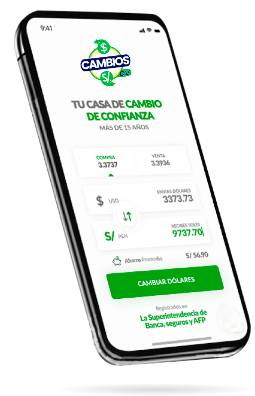 CAMBIOS DV es una plataforma digital de servicios financieros, donde puedes comprar y vender tus dólares al mejor tipo de cambio. Somos una empresa constituida en el Perú, registrada en SUNAT con RUC 20609496593 y registrados como casa de cambio digital ante la Superintendencia de Banca, Seguros y AFP para realizar el cambio de divisas online.
